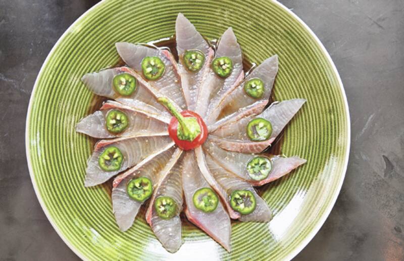 1. En una superficie lisa cortar el pescado con corte sashimi ususukuri. En un plato extendido colocar el pescado en forma decorativa como una flor, luego sobre cada corte poner 1 hoja de cilantro y encima un rodaja de ají, exprimir el limón sutil sobre el pescado, rociar aceite de oliva y soya. Espolvorear la sal y servir de inmediato.