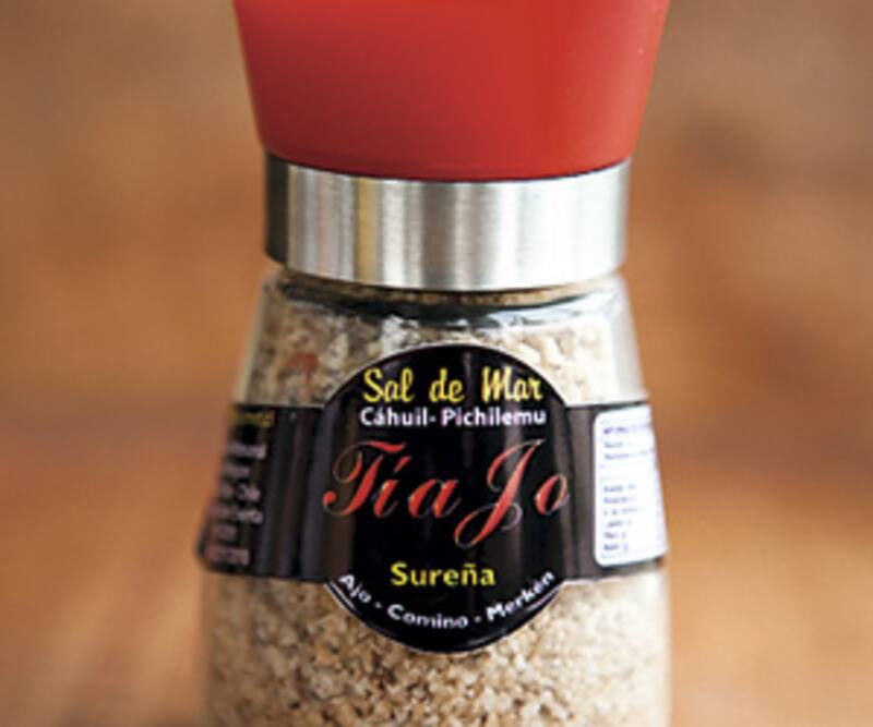 "Después de probar la sal de Cáhuil de la tía Jo —María Suazo— la invité y vino a verme de inmediato con sus productos. Juntos trabajamos para condimentarla con sabores del norte, centro y sur. La del sur, por ejemplo, es con una mezcla de ajo, comino y merquén". ($ 5.900).