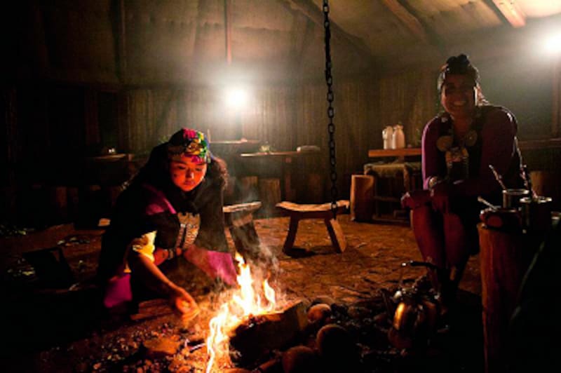 Terminadas las ceremonias en el kuxalwe, la machi (a la derecha) suele quedarse en torno al fuego compartiendo un mate.
