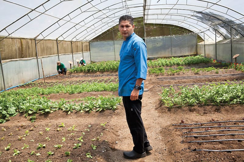 El chef Carlos Andrés Meléndez en el huerto de El Silencio Lodge.[/caption]