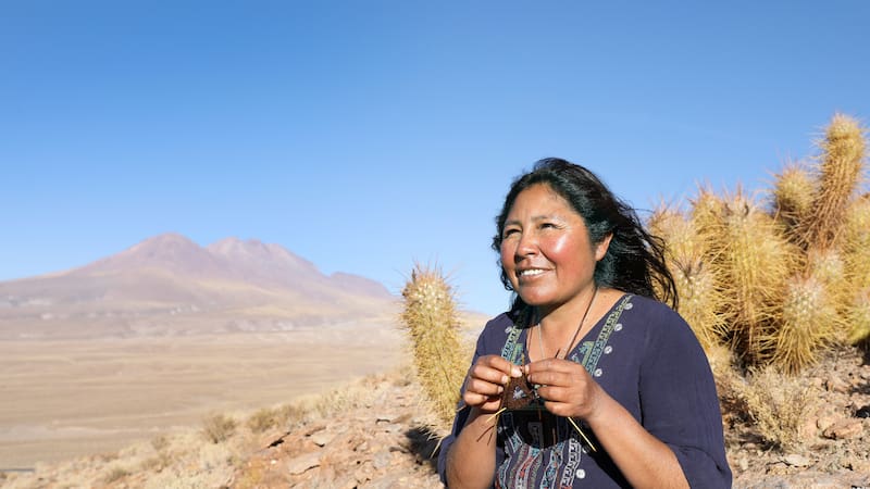 Cuando tenía 10 años, Ada Cruz, artesana textil de Socaire, aprendió a tejer con espinas de cactus, un oficio prehispánico que heredó el pueblo Lickanantay o Atacameño, del que Ada es parte y que mantiene vivo junto a las mujeres de su familia.