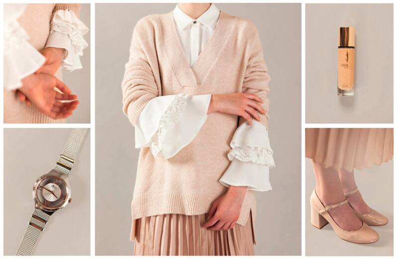 Blusa, $ 34.990, iO. Suéter, $ 19.990, H&M. Reloj, $ 131.000, Lotus. Pollera, $ 24.990, H&M. Base Touche Éclat, $ 46.990, YSL. Zapatos, $ 89.990, Prüne.[/caption]