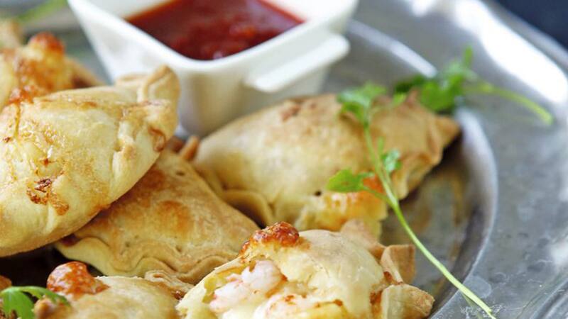 5. Para el armado, estirar la masa hasta que quede de 3 milímetros de espesor. Cortar círculos de 12 centímetros de diámetro. Rellenar cada empanada con la mezcla de queso y camarones, cerrar por la mitad y presionar con un tenedor los bordes. Con la ayuda de un mondadientes hacer un pequeño agujero en la parte superior de la empanada para permitir que salga el vapor durante el horneado.