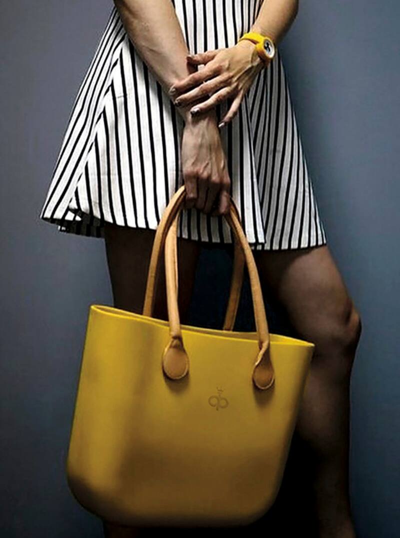 Producto destacado: cartera Yellow con correa de cuero caramel.