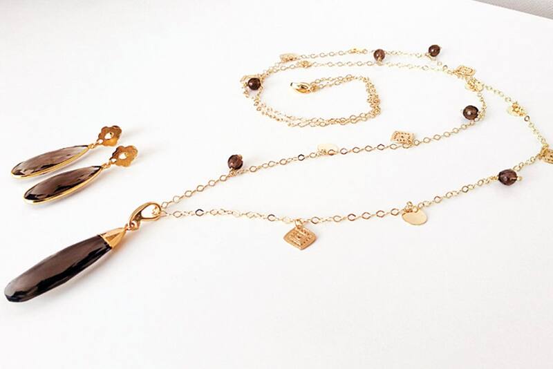 Producto destacado: conjunto de collar y aros bañados en oro 18K con piedra cuarzo fumé.