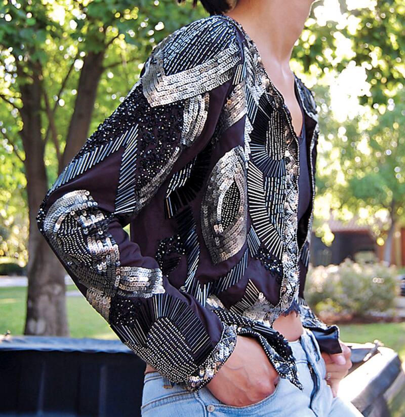 Producto destacado: chaqueta de satín bordada a mano con lentejuelas y pedrería.