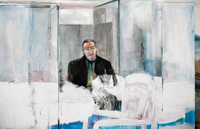 En la cafetería Sebastián es el título del retrato de Contreras hecho por su hija Magdalena. Técnica mixta de óleo y acrílico, formato de 90 x 120 cm.