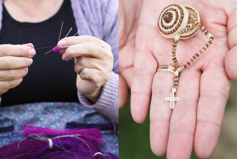La historia de las mujeres de esta familia se entrelaza en cada una de sus piezas en crin. De hecho, si alguien observa con detallada atención los globos que tejen con esta fibra, advertiría que tienen un sello único: su entrelazado es doble. Con esas esferas, la mamá de Rosario, Hortensia Medina, da forma a rosarios de hasta un metro y medio; su hija hace los más pequeños, de apenas 15 centímetros. Esa fineza del tejido es lo que distingue el trabajo de este clan. La técnica de ese cierre inquebrantable es la herencia más rica de la familia. Su abuela, Amelia Carter, la aprendió mirando a su marido. “Mi abuelo hacía lazos de cuero y también los botones para enganchar el lazo. Mi abuela dice que mirando, un día, entendió cómo le daba la famosa terminación a ese botón. Entonces se preguntó: ‘¿Por qué no lo hago en crin?’, y le resultó”. Por eso, explica Mariela, su familia es la única que le hace una terminación especial a sus globos. “Y lo hacemos hasta el día de hoy”, enfatiza.