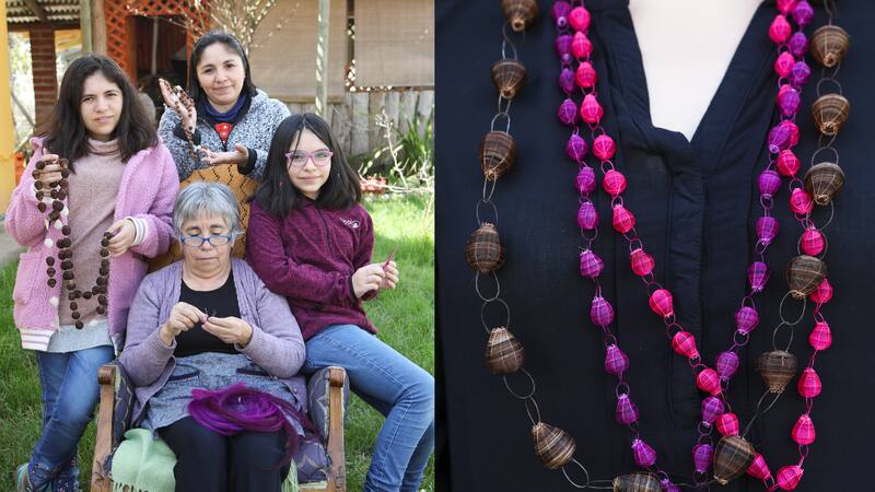Ahora, mientras muestra los rosarios que venden por cuenta propia, su hija Javiera Alarcón de 22 años, la quinta generación artesana de la familia, teje a su lado con colores encendidos. “Ella hace las cajitas de los rosarios. A mí no me salen”, dice Mariela con orgullo.