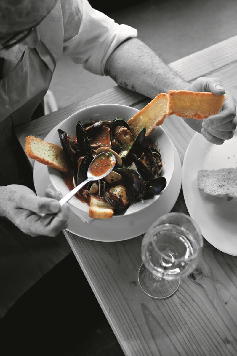 Sopa de choritos y almejas con pan de ajo (Zuppa di cozze vongole e fetunta)