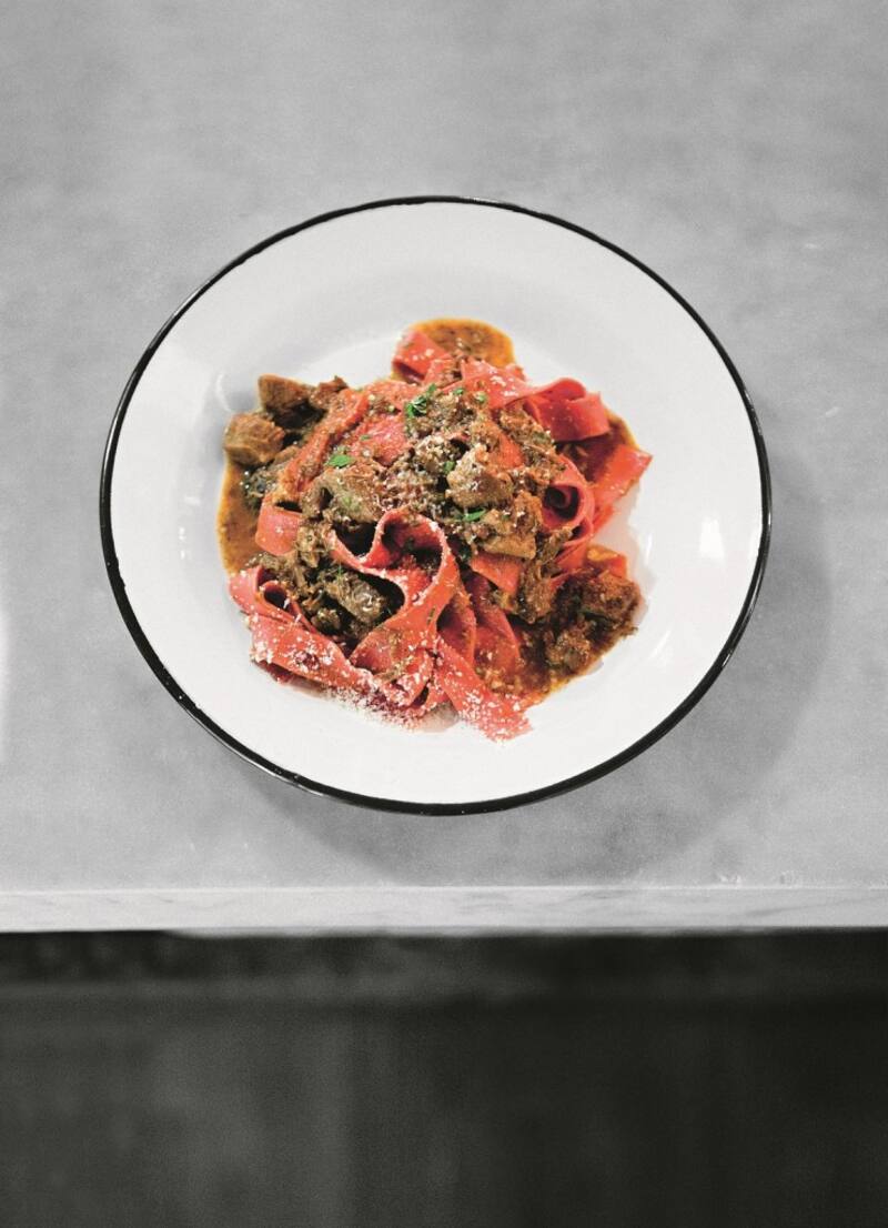 Fettuccini de betarragas con ragú de cerdo (Fettuccini alle barbine rosse con ragout de cerdo)