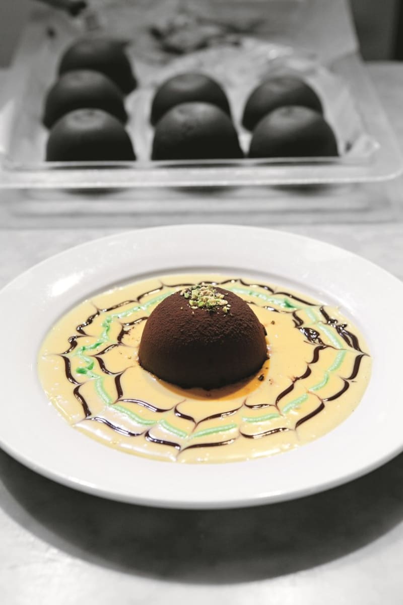 2.Desmoldar antes de servir. En platos individuales colocar una base de crema inglesa y decorar con las salsas. Colocar encima y al centro el postre. Espolvorear el cacao y decorar con los pistachos.