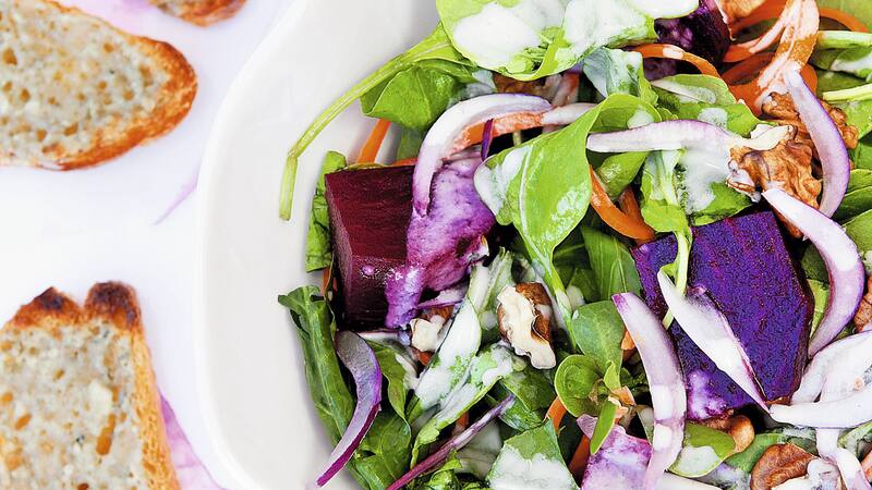 Ensalada de betarragas asadas, espinacas y tostadas de queso azul
