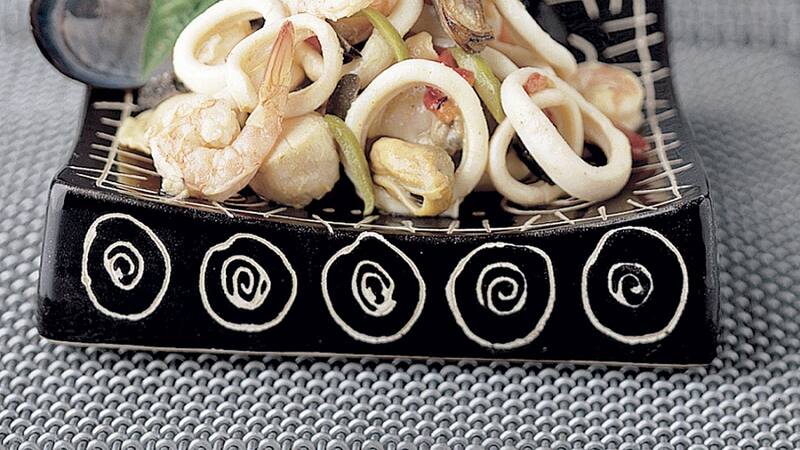 3. En una fuente de servir colocar los mariscos, agregar las aceitunas, pimentón y resto de laurel; reservar.