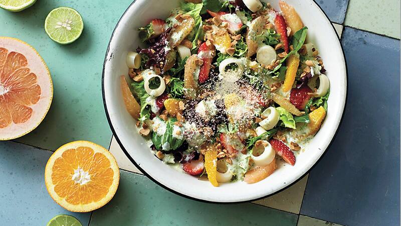 Ensalada de hojas verdes, palmitos, frutillas y cítricos