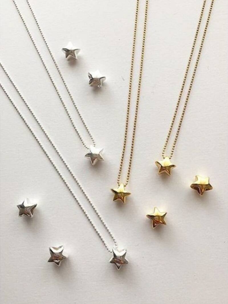 Las estrellas son una de las figuras favoritas para incorporar en los looks, tanto en la ropa como en accesorios. Rocío Vergara (34), creadora de la joyería Formas ag, tiene cadenas y estrellas colgantes hechas a mano de plata 950 ($ 27.000 con cadena de 60 cm de largo) y con baño en oro ($ 35.000 con cadena de 70 cm de largo). Otros de sus diseños destacados son las alitas de ángeles con corazón de plata ($ 22.000) y con baño en oro ($ 30.000). Disponible en Av. Italia 1449 local 6, Barrio Italia y en tienda Porquetevistes. formasag.com / Instagram: formasagtienda.