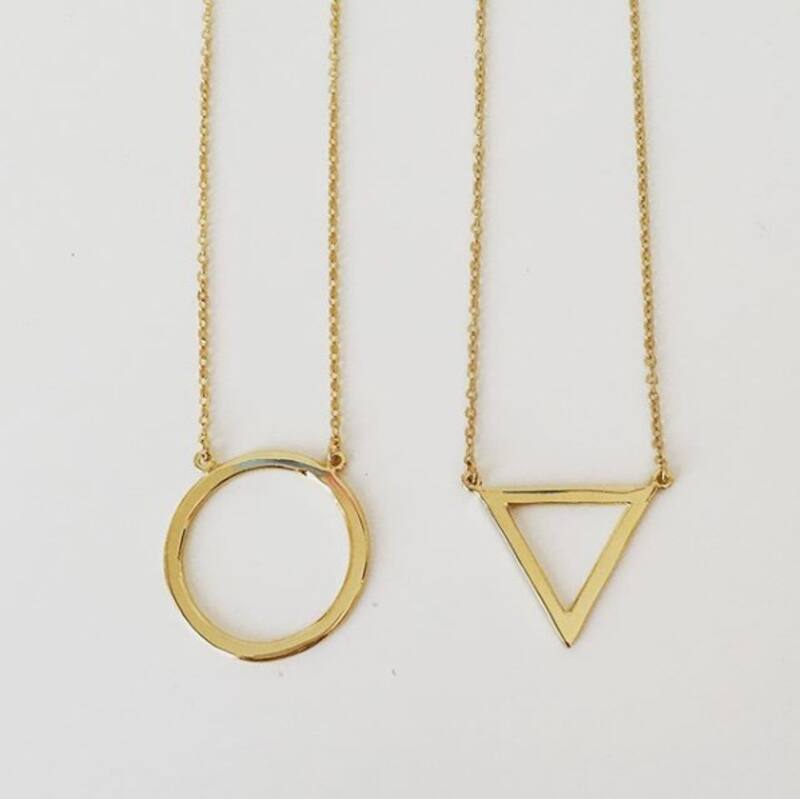 Estos simples collares geométricos son de Barbar, una joyería española que nació hace 3 años, que trabaja en plata, plata bañada en oro, y bronce. Dentro de su catálogo también hay colgantes de piedras naturales con cadenas sencillas. Consultar precios en el mail tienda@barbar.cl / Instagram: @barbarjoyas.