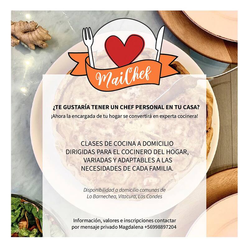 Magdalena Morales está detrás de Maichef, emprendimiento que creó con el fin de incentivar la variedad en el menú semanal y de impulsar la elaboración de recetas chilenas, comida casera e internacional. En cada clase enseña técnicas de higiene en la cocina, capacita sobre el uso de los implementos de cocina que existan en el hogar, enseña sobre guardado, descongelación, recalentamiento seguro de alimentos y eficiencia en el calculo de porciones al cocinar de acorde a lo que requiera cada ocasión. Realiza clases individuales o grupales (2 a 3 alumnos) a domicilio dirigidas para el cocinero del hogar. Sus opciones son variadas y adaptables a las necesidades de cada familia con opciones como pastel de choclo, pollo arvejado, escalopas, albóndigas, fritos de coliflor, gazpacho, paella al wok, tortilla de papas, curry de pollo, lasaña de espinaca, entre muchas otras opciones. Cada clase cuenta con preparación para aproximadamente 6 personas (la comida preparada queda en tu casa), dura alrededor de dos horas e incluye las recetas impresas de cada preparación. Para pagar se debe abonar el 50% antes y el resto el día de la clase o curso. Horarios: Mañana 9.30 – 11.30 Tarde: 16.00 – 18.00hrs. También se puede solicitar un horario diferente. Disponibilidad en Lo Barnechea, Las Condes y Vitacura. Más información e inscripciones al Whatsapp +56998897204.