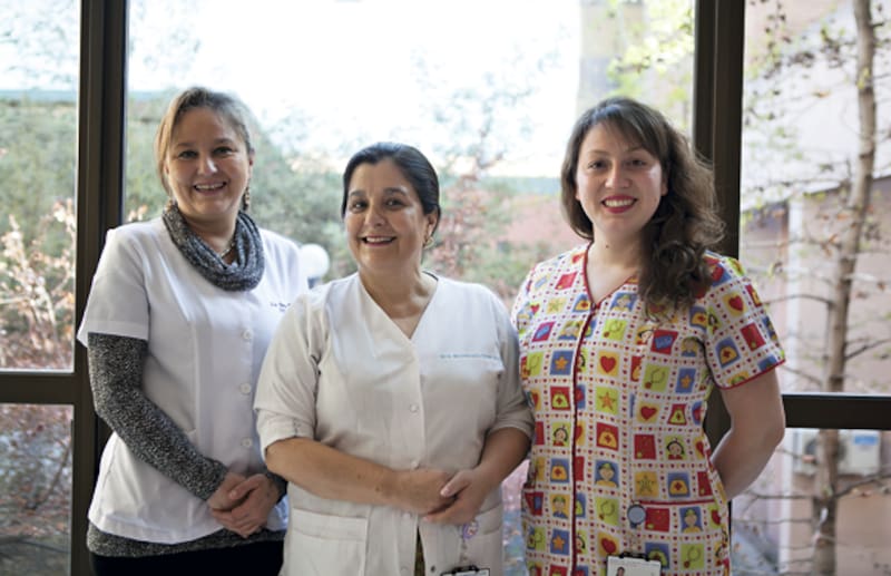 El equipo de profesionales que ha impulsado este programa en el Hospital San José. De izquierda a derecha: la doctora Agustina González, jefa de Neonatología; Giovanna Loguercio, pediatra jefa del programa Chile Crece Contigo y su matrona coordinadora, Verónica Valdivia.
