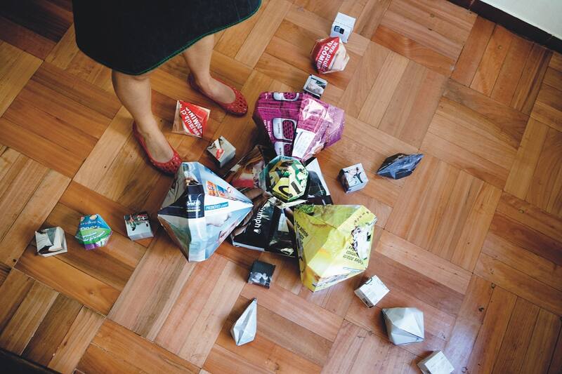 "Primero tuve que entender el tamaño de la revista. Saber que cada página mide 27 x 21 cm, que se traduce en 245 centímetros cúbicos de esculturas. Trabajé con los elementos básicos de una revista, el papel y las tonalidades del perfil de impresión CMYK, para hacer algo con volumen. Quise que la forma le ganara a la imagen. La composición refleja la mecanización del trabajo de doblar el papel. Estas figuras pueden flotar. Puestas en el suelo no se aprecian sus características volumétricas, pero cuando son activadas en agua vuelven a tener volumen y recuperan su sentido: ser flotadores". Francisca Sánchez (34), artista y antropóloga.