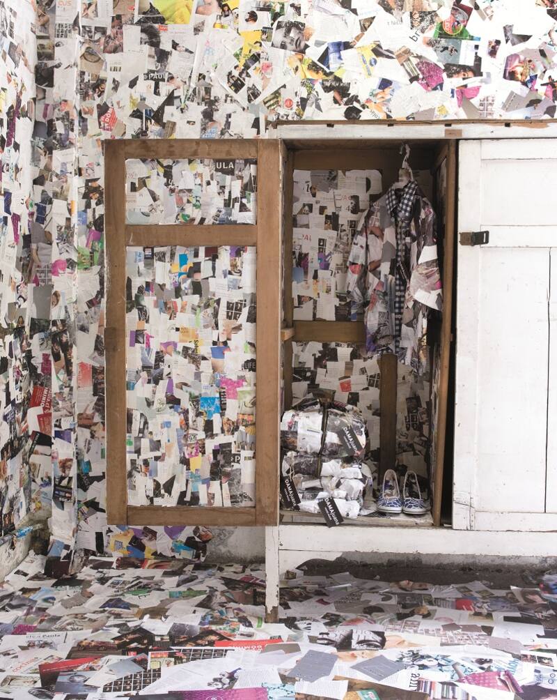 Buscaron colores. Tipografías. Fotos. Cortaron las páginas de Paula en pedazos y las transformaron en papel mural. Luego de observar la pared, Trinidad Lira (28) y Juan Pablo Nazar (30) –socios de DAMAjuana, una marca de accesorios contemporáneos hechos con técnicas artesanales–, decidieron incorporar un armario. "Tiene que ver con la ropa", pensaron. "Y Paula es un revista de moda". De a poco, pegaron los miles de cuadrados de papel en el ropero y en zapatos y camisas. "En DAMAjuana reinventamos las técnicas tradicionales y quisimos hacer lo mismo con el collage", señala Juan Pablo.