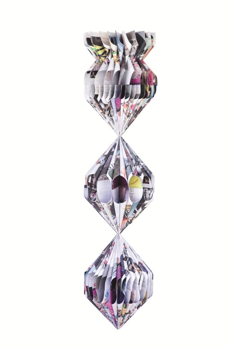 Sin pegamento. Sin tijeras. Sólo con tres ejemplares de Paula. Doblando cada página hasta conseguir figuras geométricas que se sostienen solas, la diseñadora Solange Heilenkötter (46) hizo una escultura colgante de más de un metro y medio de altura. Inspirada en las lámparas y figuras que realiza con polipropileno, un material plástico durable y resistente al agua –visiblemente similar al papel por su color y textura– Solange usó el número aniversario de Paula como un objeto en sí mismo. "No quise intervenir la revista, sino entenderla como un todo. El material me dio la forma y terminó siendo una escultura que, como mi trabajo, se basa en principios geométricos", describe.