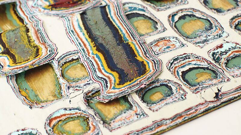Desde que estudiaba artes visuales en la Universidad Católica, Colomba Fontaine tenía una inquietud constante por experimentar y ensayar con distintos materiales. Su taller, dice, siempre ha parecido un laboratorio. Por eso, el conocimiento profundo que adquirió del grabado tradicional –que estudió durante dos años luego de terminar la universidad–, lo aplicó para hacer pruebas con materiales maleables, como la parafina sólida y la cerámica gres. Así, terminó elaborando un método creativo único que, hasta el momento, solo ella ocupa en el país: superponer hasta 20 capas de esmalte y de cera, una arriba de otra, creando soportes de escaso grosor que luego, antes de que se sequen, talla con puntas finas, trazando relieves que dejan entrever las capas y dando paso a imágenes abstractas coloridas. "Es como cuando se corta una torta y se ven las distintas capas; con cada tallado aparece algo nuevo", explica la artista, cuyas obras se exhiben hasta el 11 de marzo en la galería Nac, en su segunda muestra individual.