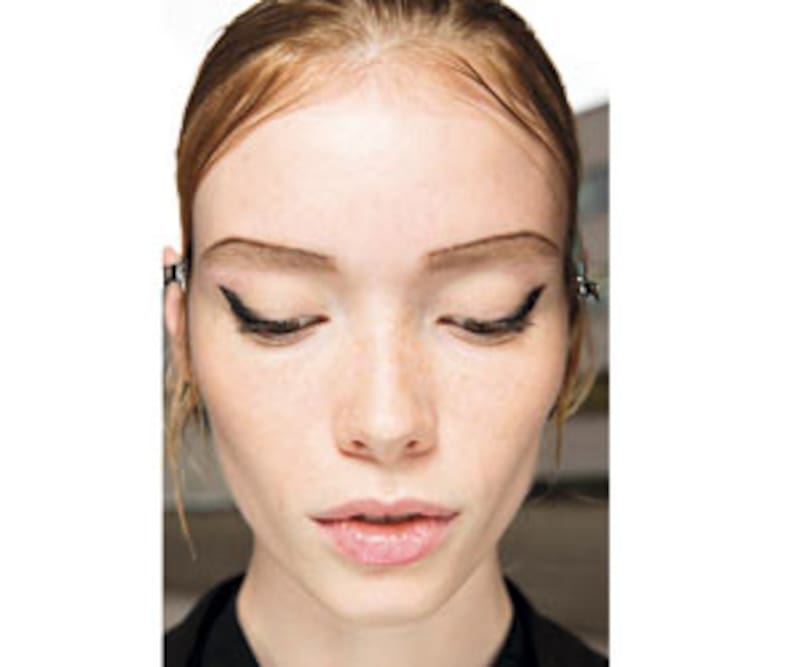 Nada sutil, no respeta ni por asomo el diseño natural de las cejas. Aunque el delineado de un solo trazo ha sido condenado como imperdonable, Prada obvió esa verdad y lo propuso como parte fundamental de su maquillaje.