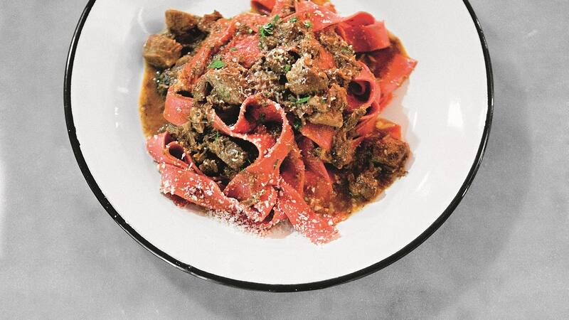 Fettuccini de betarragas con ragú de cerdo