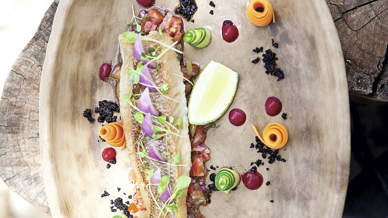 Filete de pargo frito con puré de betarraga y salsa virgen