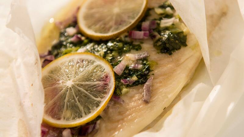 3. En una lata de horno colocar los papillotes y hornear 10-12 minutos o hasta que el pescado esté cocido. Retirar del horno.