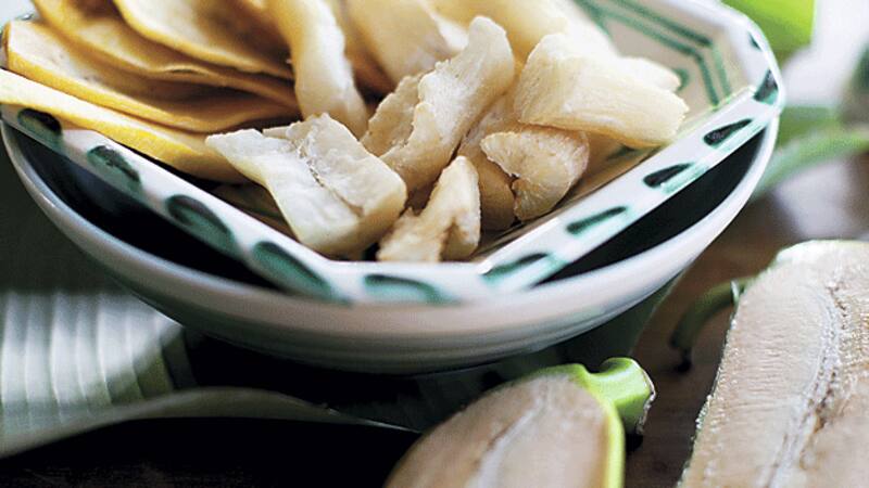3- En otra olla calentar el aceite a fuego medio-alto y freír la mandioca reservada, de a pocas cantidades, hasta dorar. Con una espumadera retirar de la olla y estilar en papel absorbente. Repetir el mismo procedimiento con el plátano. Servir de inmediato.