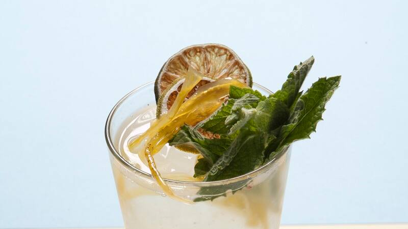 Hojas de menta y rodajas de limón deshidratadas para decorar