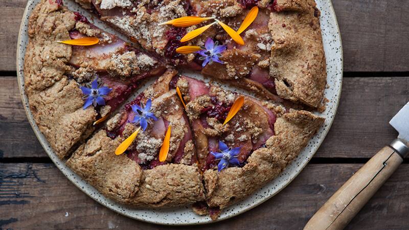 6. Estirar la masa entre dos láminas antiadherentes con un uslero, puede ser papel o silpad, formando un círculo. Rellenar la galette con la mermelada, procurando dejar un borde sin relleno. Sobre la mermelada poner de forma ordenada la pera cortada en láminas. Doblar el borde sin relleno con mucho cuidado hacia arriba para contener las peras y la mermelada. Espolvorear sobre las peras y la masa panela y la harina de almendras y masa que sobró.