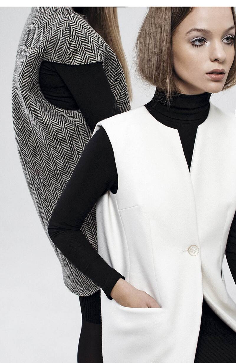 En gris, abrigo sin mangas englobado en la espalda, en paño de lana de Bellavista Oveja Tomé. En blanco marfil, chaqueta de alpaca sin mangas.