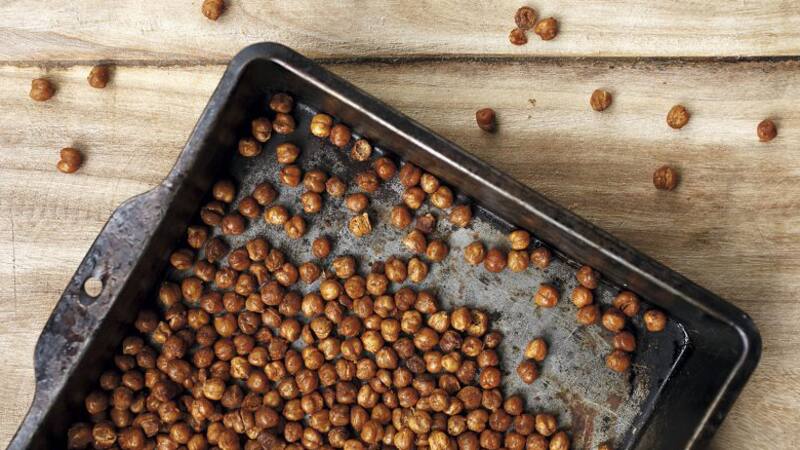 1. Precalentar el horno a 200°C. Colar y enjuagar los garbanzos para quitarles un posible exceso de sodio. Luego secarlos con toalla de papel varias veces para que absorba líquido. La idea es que queden lo más secos posible.