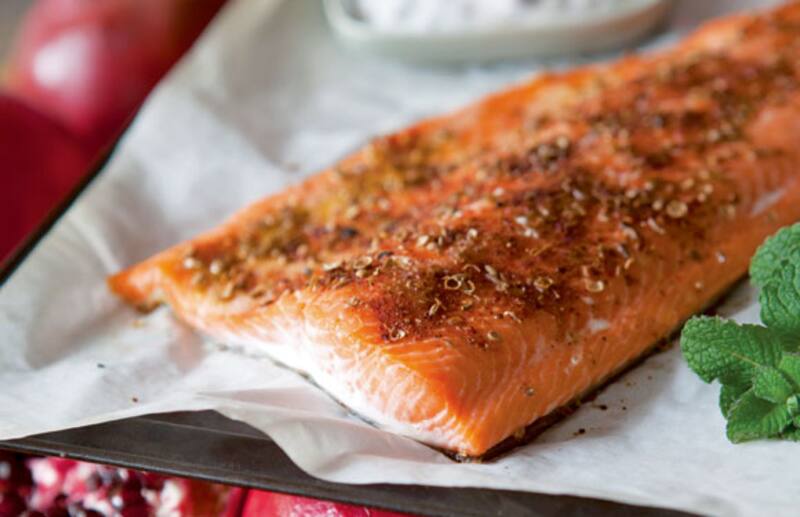 3. Retirar el salmón del refrigrador. Rociar el aceite de oliva sobre el filete de salmón y hornear 20 minutos o hasta que esté dorado pero rosado al centro. Dejar reposar 2 minutos y servir de inmediato con la raita de granada y hierbas reservada.