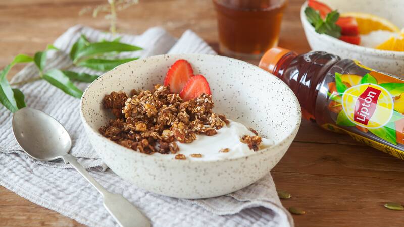 Incorporar esta mezcla al bol, revolviendo bien. Es importante que la avena y el mix de semillas y frutos secos se vayan ligando con esta “miel de dátiles y Ice Tea” para que después la granola resulte más crocante.