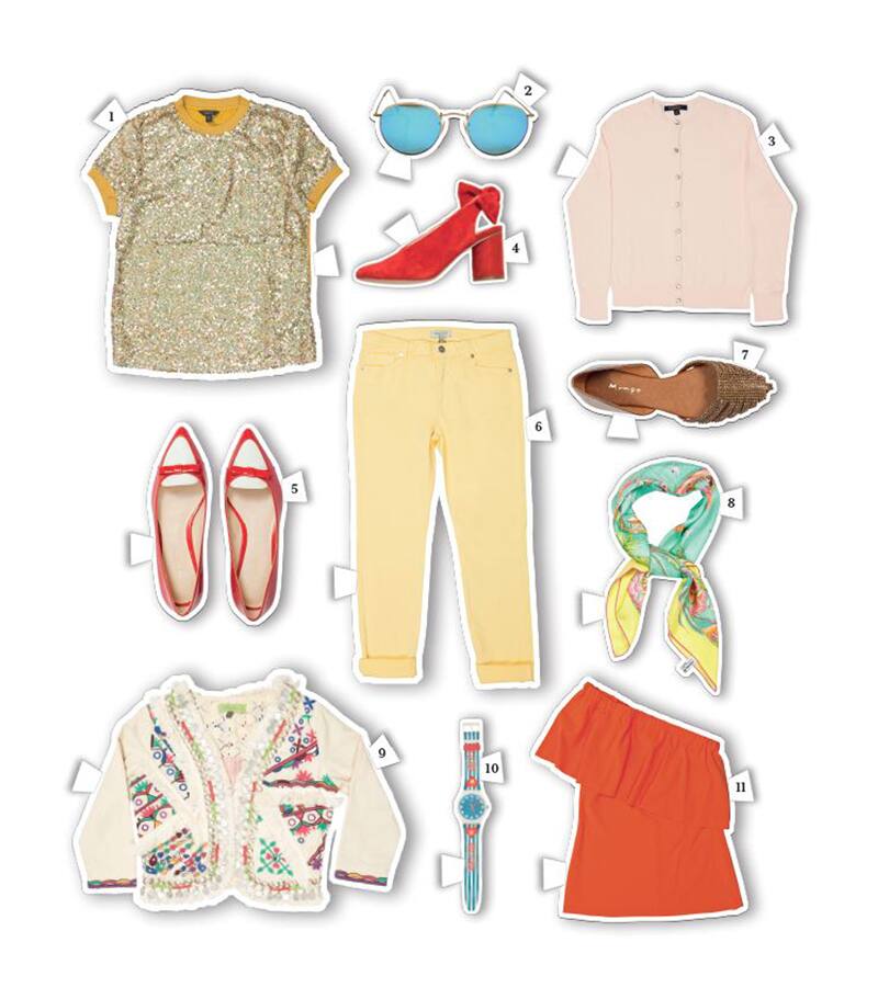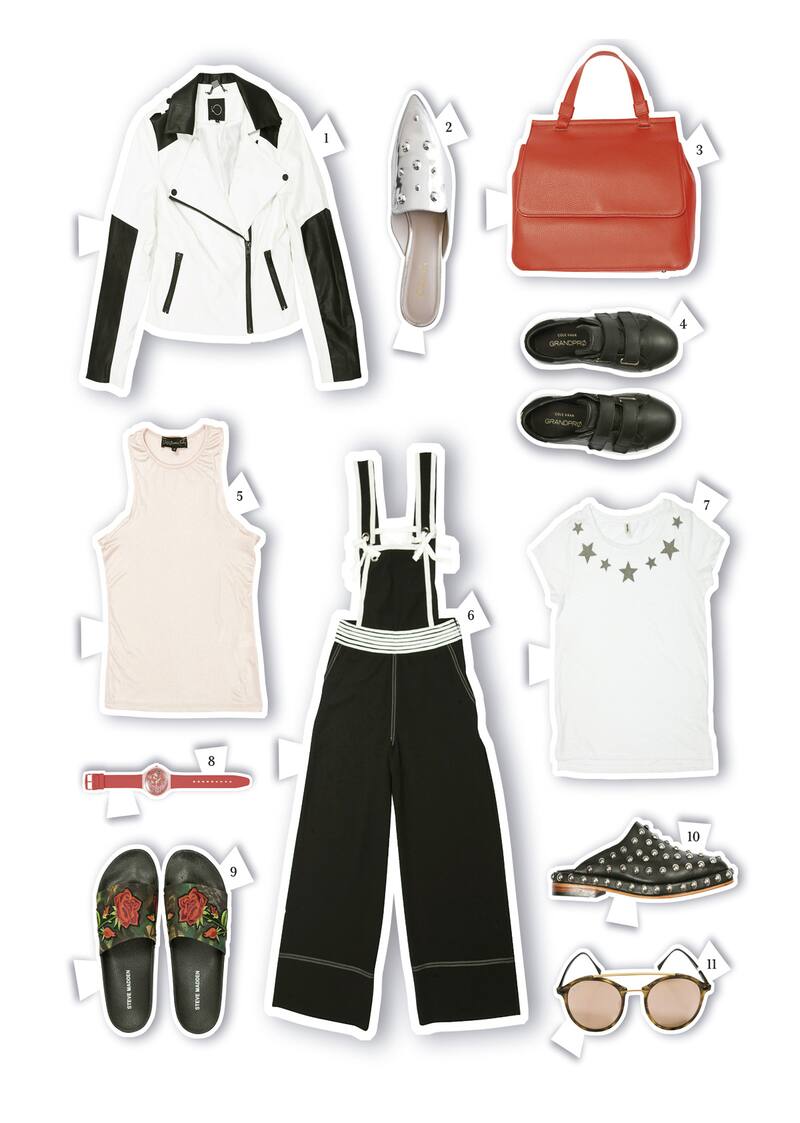 1. Chaqueta, $ 49.990, iO. 2. Puntillas, $ 49.950, Gacel. 3. Cartera, $195.000, Brooks Brothers. 4. Zapatillas, $129.990, Cole Haan. 5. Polera, $19.900, Liola. 6. Jardinera, $ 84.900, Guess. 7. Polera Blugirl, $ 5.990, Tricot. 8. Reloj, $ 89.900, Swatch. 9. Sandalias, $ 29.990, Steve Madden. 10. Puntillas, $145.990, Prüne. 11. Anteojos Ray-Ban, $189.900, Rotter & Krauss.[/caption]