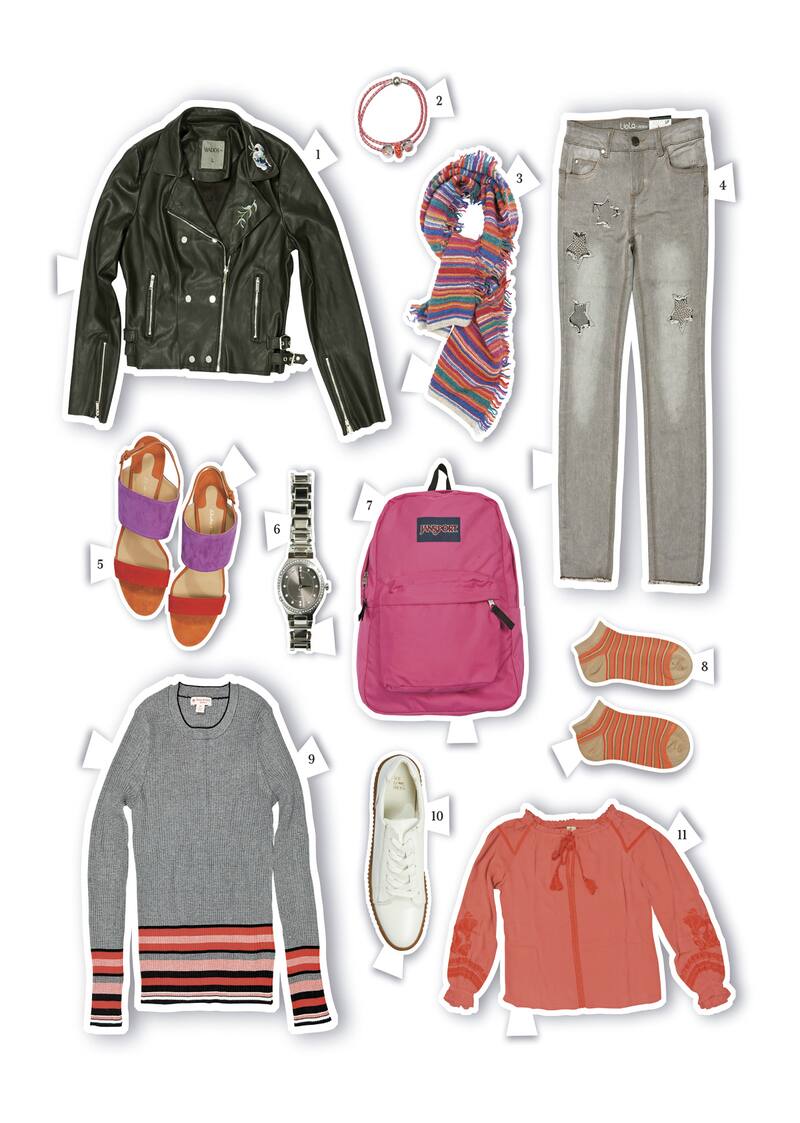 1. Chaqueta, $ 46.990, Wado'ss. 2. Pulsera, $ 50.800, Pandora. 3. Chalina, $ 68.900, Kuna. 4. Jeans, $ 33.900, Liola. 5. Sandalias Salvatore Ferragamo, preguntar precio en tienda. 6. Reloj, $143.000, Festina. 7. Mochila Jansport, $ 24.990, Rockford. 8. Calcetines, $ 5.990, Hush Puppies. 9. Suéter, $ 82.000, Brooks Brothers. 10. Zapatillas, $ 34.990, We Love Shoes. 11. Blusa, $ 39.900, Saville Row.[/caption]
