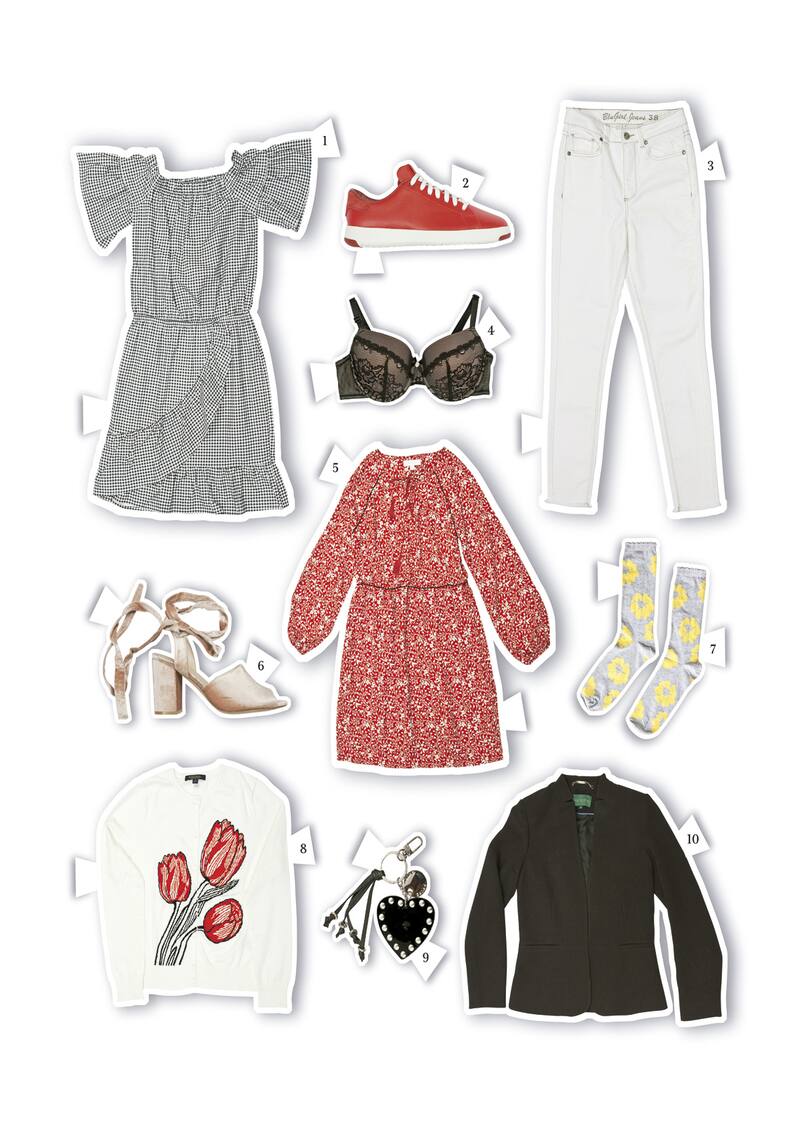 1. Vestido Sfera, $ 27.990, Ripley. 2. Zapatillas, $129.990, Cole Haan. 3. Pantalón, $ 8.990, Tricot. 4. Sostén, $14.990, Flores. 5. Vestido Cortefiel, $ 44.990, Falabella. 6. Zapatos, $ 64.900, Nine West. 7. Calcetines, $ 3.990, Monarch. 8. Chaleco, $116.000, Brooks Brothers. 9. Llavero, $12.990, Prüne. 10. Chaqueta, $ 59.990, Magriffe.[/caption]
