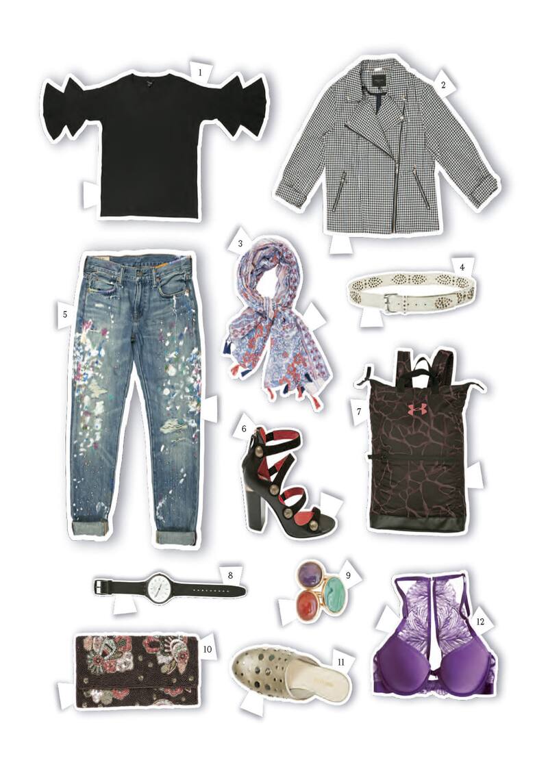1. Suéter Marquis, $14.990, Ripley. 2. Chaqueta Cortefiel, $ 59.990, Ripley. 3. Pañuelo, $12.990, Wado's. 4. Cinturón, $ 55.990, Rapsodia. 5. Jeans, $168.000, Polo Ralph Lauren. 6. Sandalias Pura López, $ 279.990, Mingo. 7. Mochila, $ 29.990, Under Armour. 8. Reloj, $ 89.900, Swatch. 9. Anillo, $ 219.000, Tous. 10. Clutch, $ 42.990, Benetton. 11. Puntillas, $ 64.900, Nine West. 12. Sostén, $ 34.990, Triumph.[/caption]
