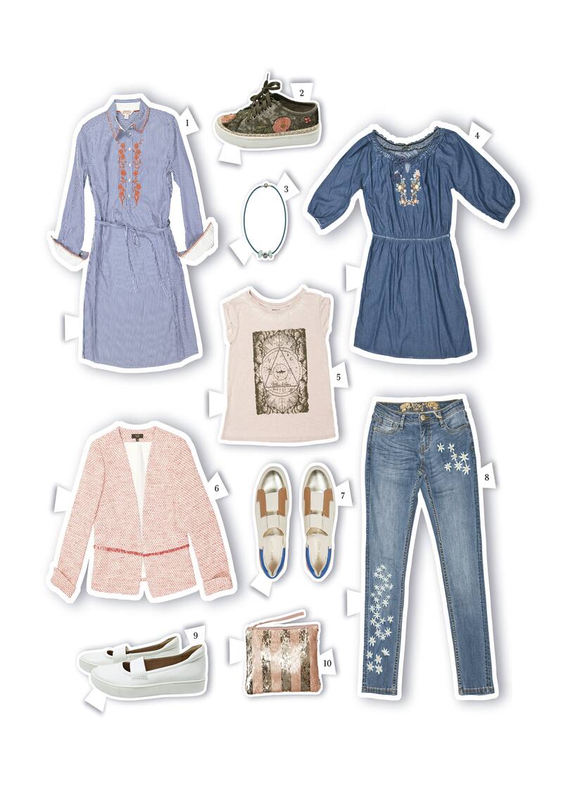 1. Vestido, $ 90.000, Brooks Brothers. 2. Zapatillas, $ 49.990, Zappa. 3. Colgante, $ 50.800, Pandora. 4. Vestido, $ 27.990, Wado's. 5. Polera, $ 9.990, Maui & Sons. 6. Chaqueta 1.2.3, $ 99.990, Falabella. 7. Zapatillas, $ 69.900, Nine West. 8. Jeans Desigual, $ 74.990, Falabella. 9. Zapatos, $ 49.990, Naturalizer; 10. Clutch, $19.990, Secret.[/caption]