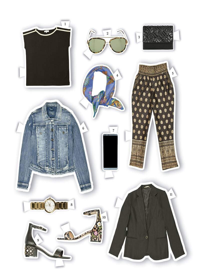 1. Polera, $ 32.900, Saville Row. 2. Anteojos Marc Jacobs, $ 249.900, Rotter & Krauss. 3. Clutch, $15.990, Secret. 4. Pañuelo Salvatore Ferragamo, preguntar precio en tienda. 5. Pantalón, $ 95.990, Rapsodia. 6. Chaqueta, $ 36.900, Liola. 7. Celular G6, $ 649.990, Huawei. 8. Reloj, $124.000, Festina. 9. Sandalias, $ 62.990, Steve Madden. 10. Sandalias, $ 69.990, Steve Madden. 11. Chaqueta, $ 89.900, Saville Row.[/caption]