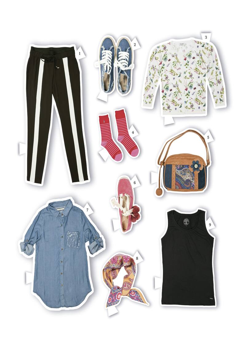 1. Pantalón, $ 26.990, iO. 2. Zapatillas, $ 21.000, Azaleia. 3. Chaleco, $ 49.900, Saville Row. 4. Calcetines, $ 5.990, Hush Puppies. 5. Cartera, $ 39.990, Rockford. 6. Pañuelo, $ 25.990, Rapsodia. 7. Blusa, $ 29.990, Wado's. 8. Alpargatas, $114.900, Castañer. 9. Polera Blugirl, $ 7.990, Tricot.[/caption]