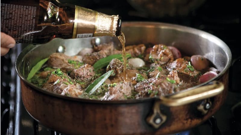 Guiso de punta de picana con tocino, chalotas, champiñones y cerveza malta