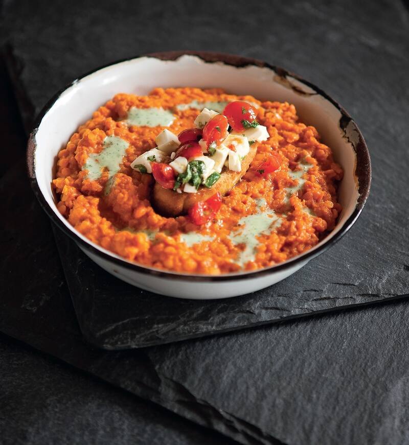 Guiso de tomate y lentejas rojas con toque de curry y leche de coco, crostini de tomate y quesillo