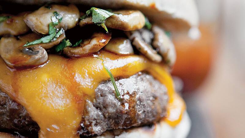 Hamburguesa de vacuno con queso cheddar, salsa BBQ y champiñones salteados