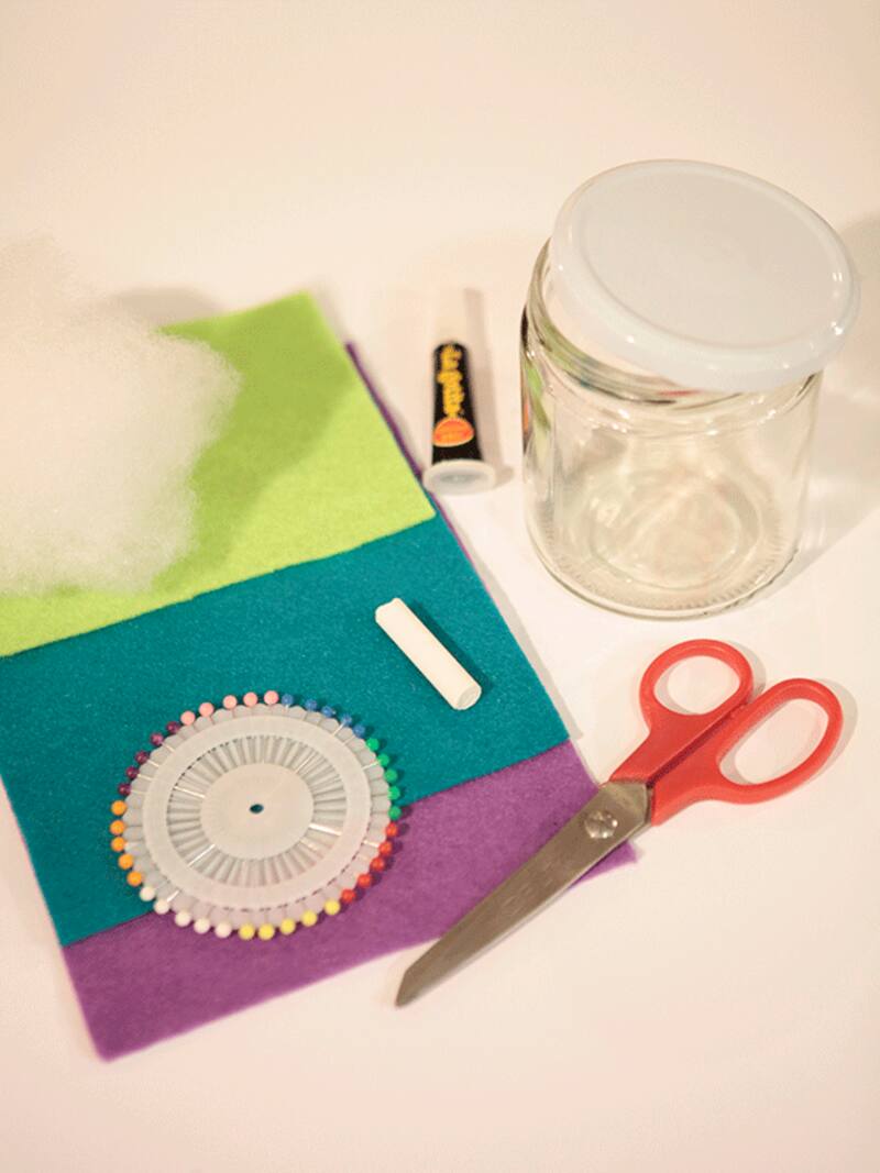 Poner la tapa del frasco sobre la lámina de fieltro más grande y marcar con la tiza un círculo a dos centímetros aproximadamente. Luego cortarla.