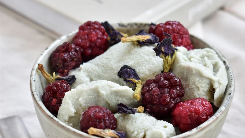 - Calienta 1/2 taza de la leche evaporada, agrega un puñado de la flor y espera a que cambie su color a un azul vibrante. Una vez fría la mezcla, retira la flor.